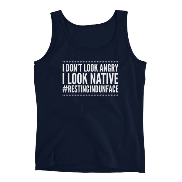 Every Native has to answer at some time or another if they’re mad or not. I’m not mad, I’m Native. Let this shirt be your answer. I Don’t Look Angry, I Look Native #restingindunface . Makes a great gift. Funny Native Humor. This lightweight tank top features wide shoulder bands. It’s light, cool and definitely a “must-have” in every woman’s wardrobe.